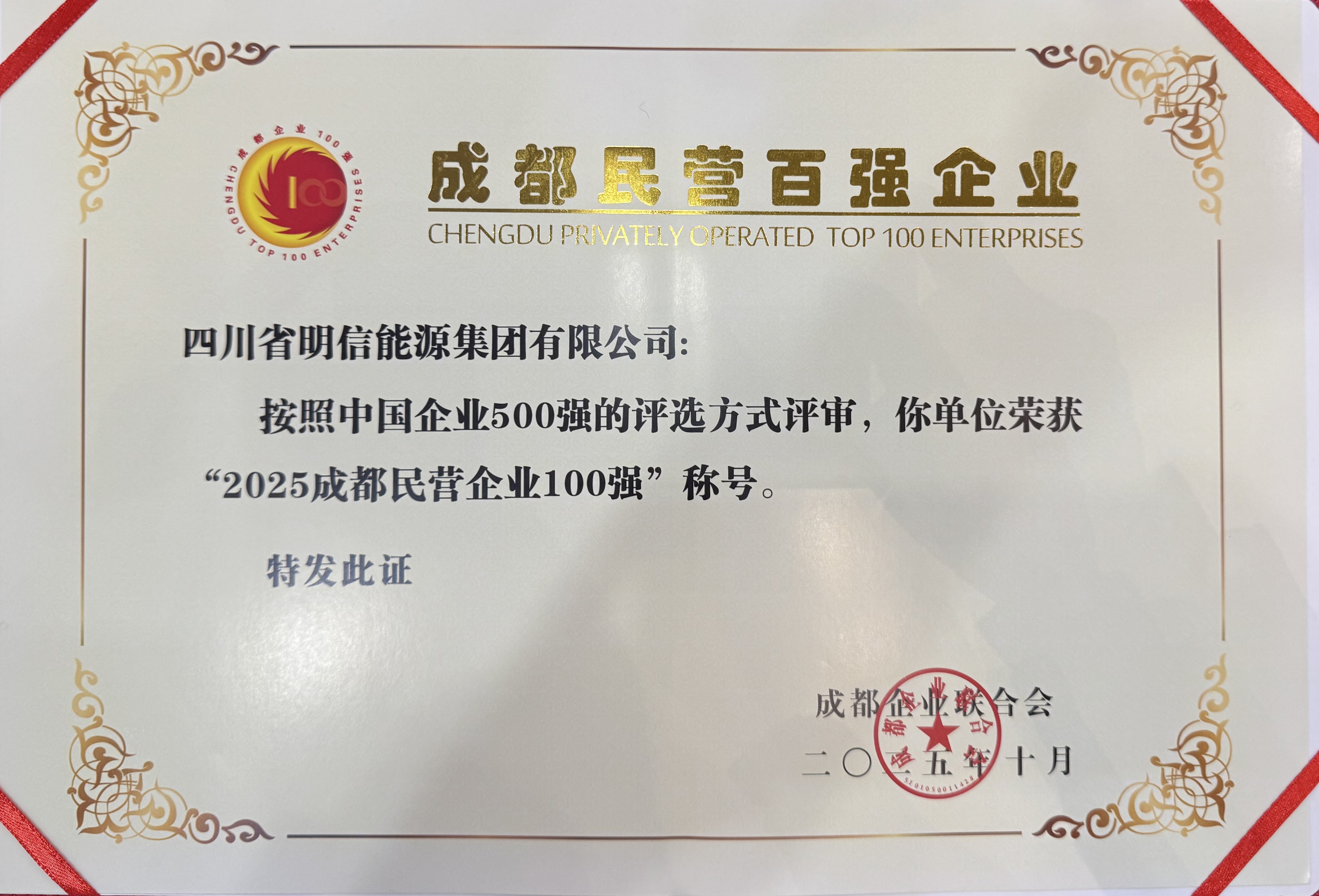 2025年10月28日,由成都市民政局、成都市慈善总会指导、成都企业联合会主办的“成都市企业创新发展大会”在成都顺利召开。大会权威发布了“2025成都民营企业100强”榜单,四川省明信能源集团有限公司凭借持续增强的综合实力与高质量发展成效,成功蝉联榜单,并从2024年第62位显著提升至2025年第41位,实现排名跨越式上升21位!
